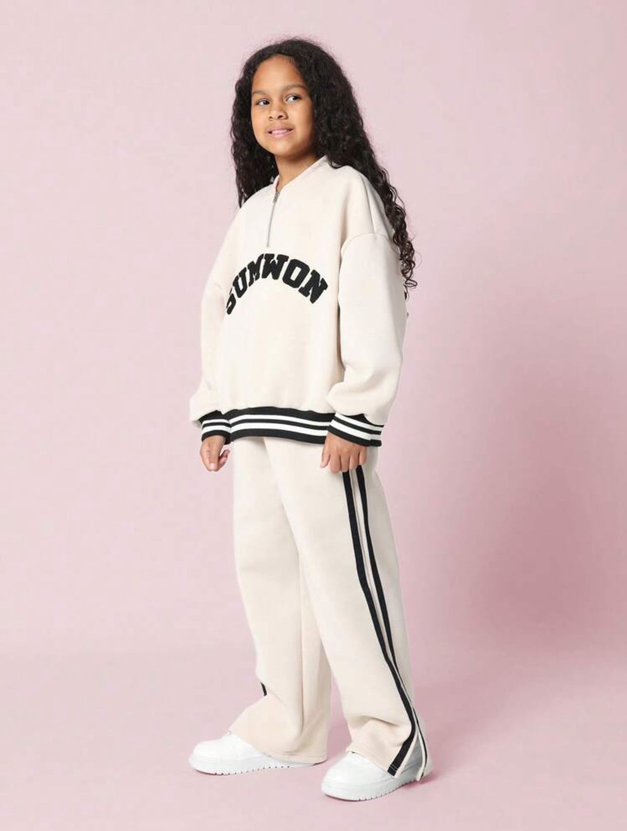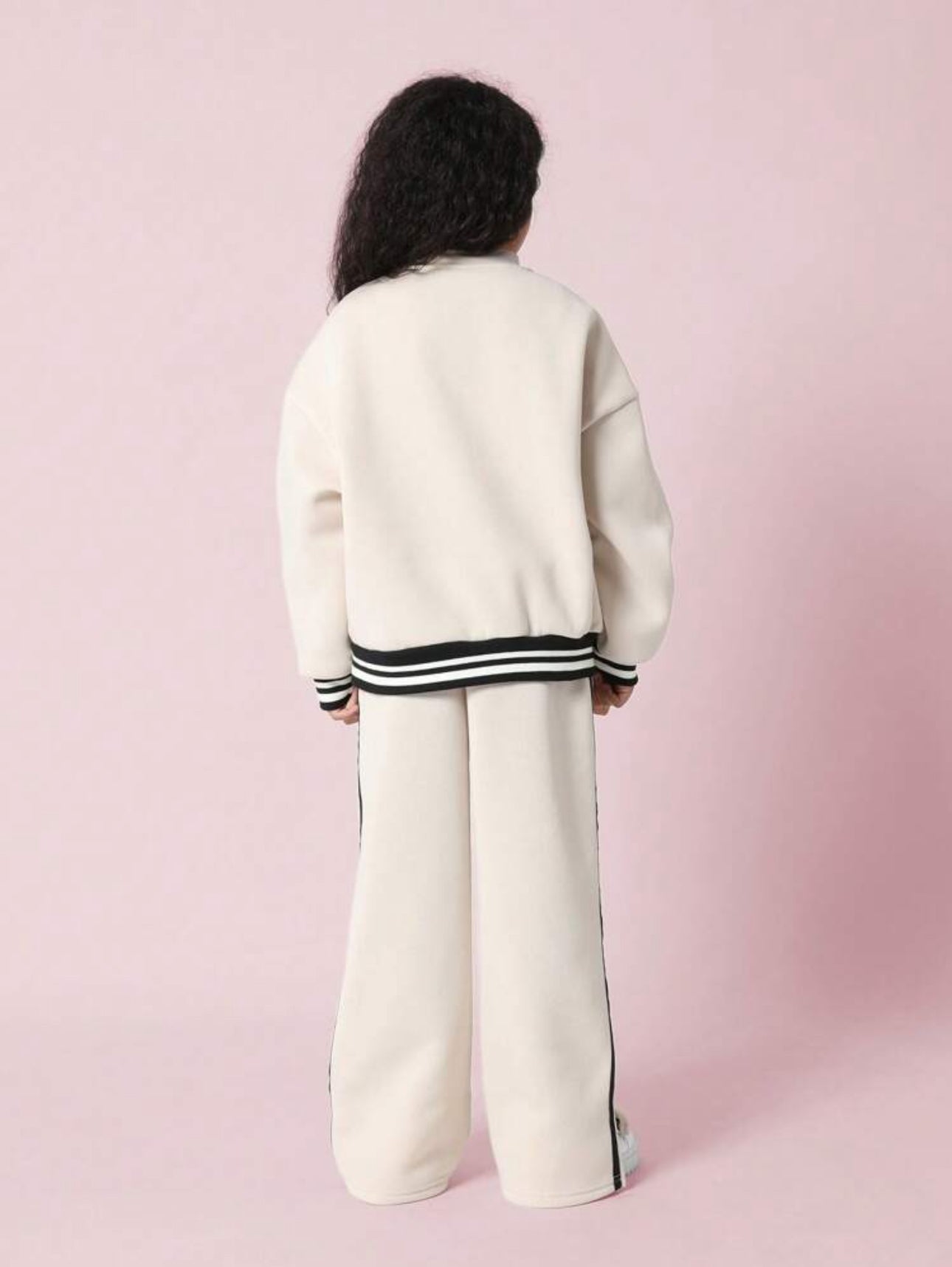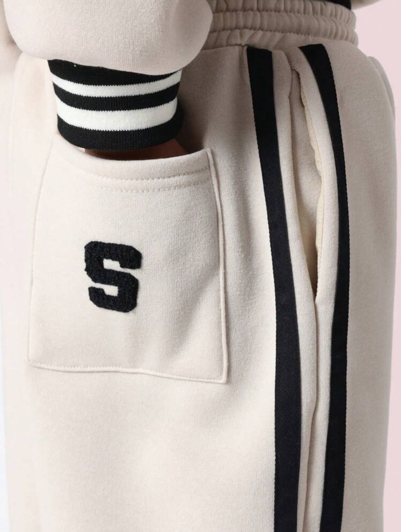 Vintage varsity vibes. The Kenya Set features bold black side stripes and a retro varsity-style sweatshirt with “London” print.
