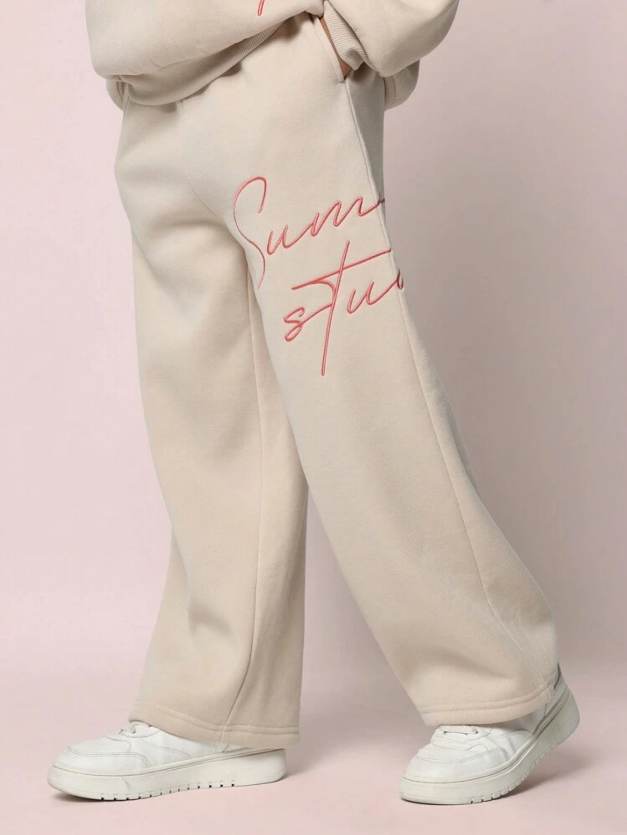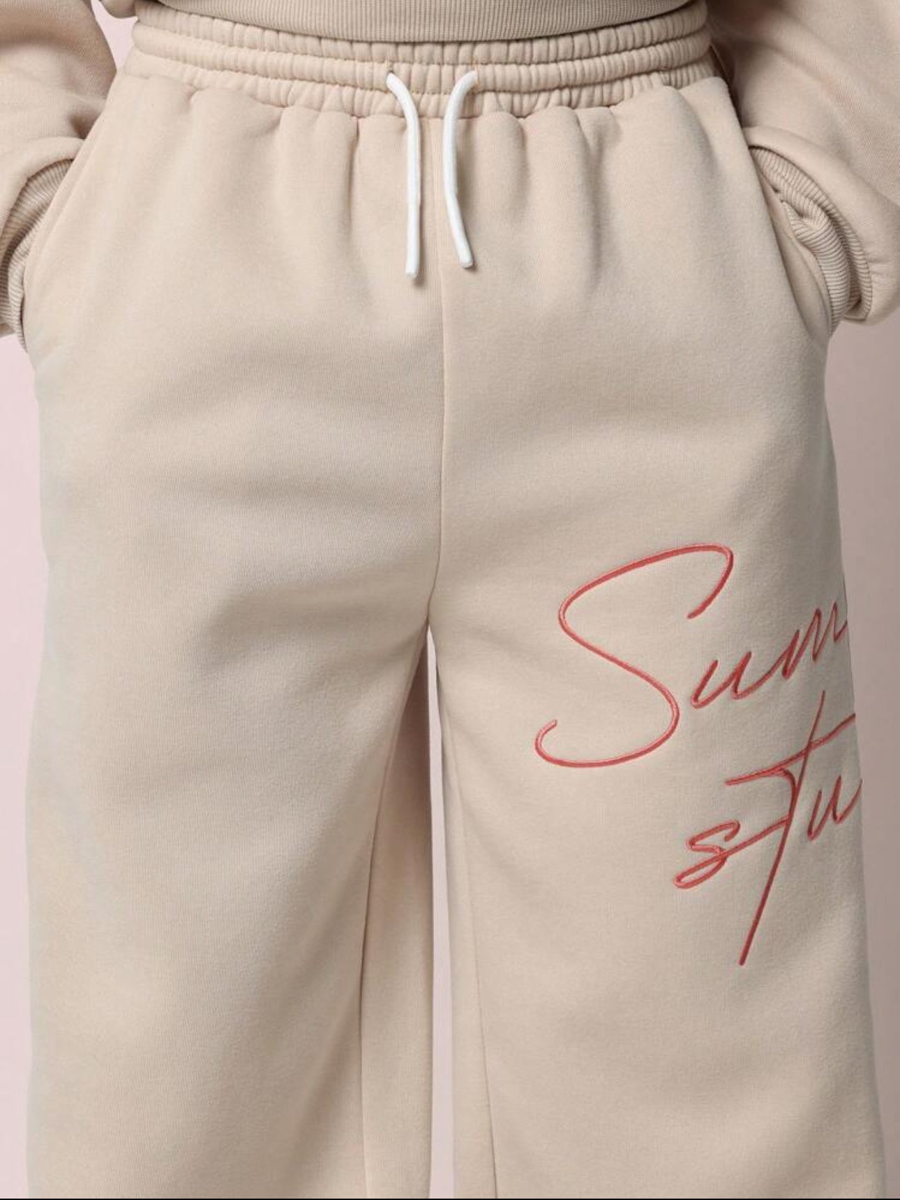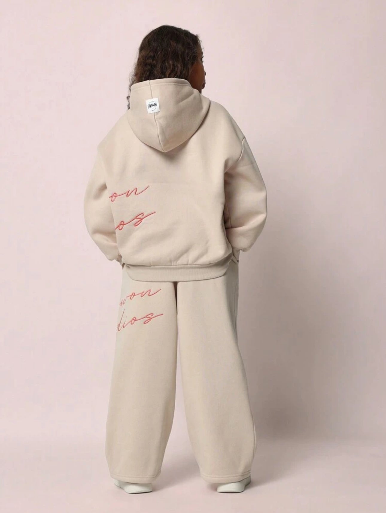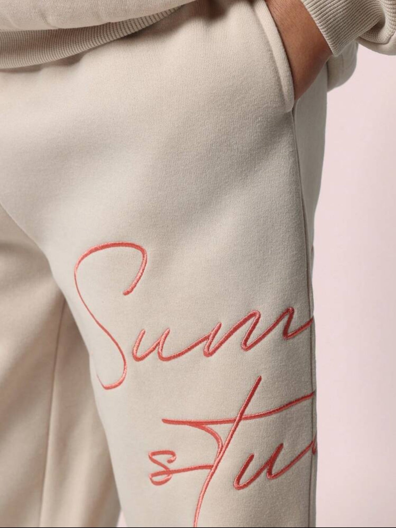 Clean and dreamy. The Zuri Set offers minimalist style in warm oatmeal tones, finished with soft cursive embroidery on the chest and pant leg.